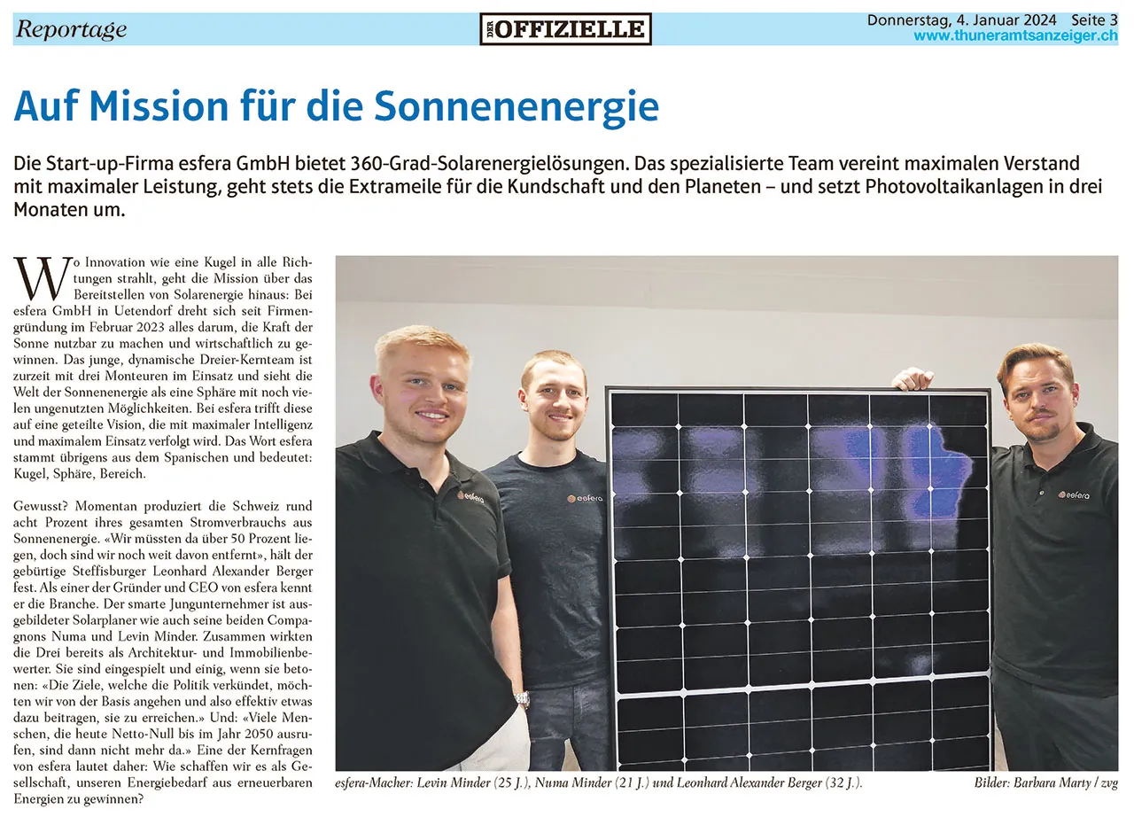 Die Start-up-Firma esfera GmbH bietet 360-Grad-Solarenergielösungen. Das spezialisierte Team vereint maximalen Verstand mit maximaler Leistung, geht stets die Extrameile für die Kundschaft und den Planeten – und setzt Photovoltaikanlagen in drei Monaten um.